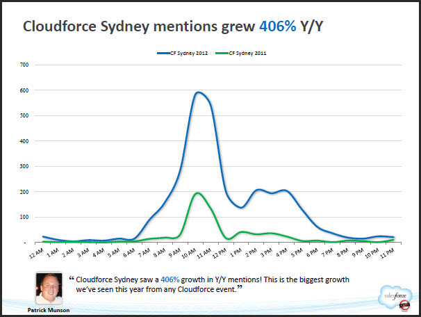 "The 2,986 mentions of #cloudforce on the 14th June represents a phenomenal 406 per cent growth on last year's #cloudforce Sydney."