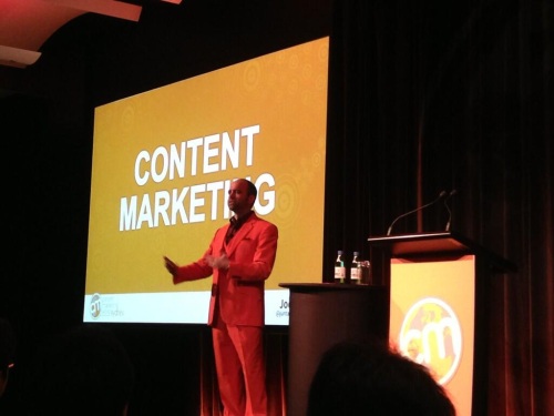The MC announces "..and let's welcome to the stage the Godfather of Content Marketing... Mr. Joe Pulizzi..." and with a huge round of applause Joe jumps onto stage in a bright orange suite with matching shoes! It was a quite a sight to see.