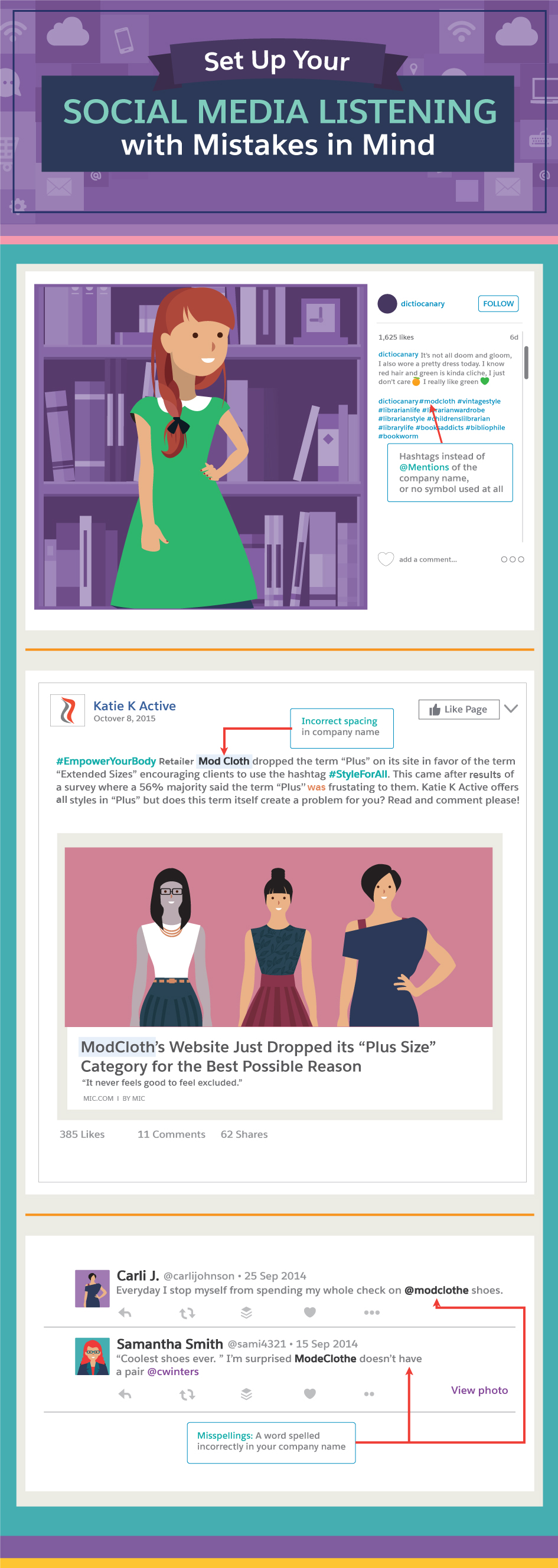 Besides hashtag use, be sure to track misspellings of your brand and products as well. ModCloth also needs to track the results of ‘Modclothe’, a surprisingly common misspelling, and ‘Mod Cloth’. There are plenty of opportunities for the ModCloth team to engage with customers on Twitter, Instagram, and Facebook, and they have to be on top of the variations in how their audience addresses them. To come up with hashtags and misspellings, brainstorm options with your team in a shared space, or look at the customer service archives or Google AdWords data to see if there are any common misspellings.