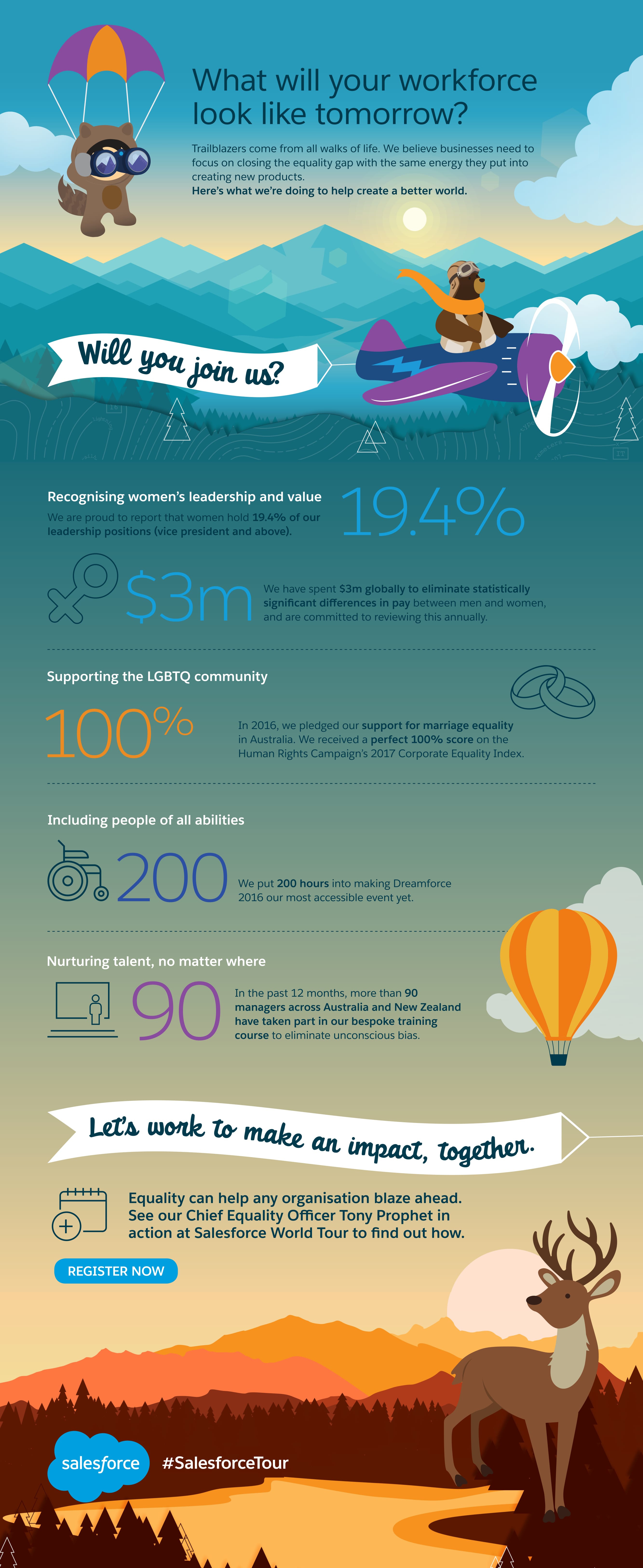 We are committed to living and breathing this value in everything we do at Salesforce - including our events - and I am honoured to be joining the Sydney World Tour 2017 on March 21st. Here are just a few of the the things I am most excited about and I am hopeful you will feel inspired to come along and help us blaze a trail to equality for all.