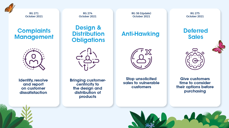 Secondly, it’s easy to see how each one leverages the other in some way. If we take complaints as an example, they are necessary for capturing and reporting on potential breaches of anti-hawking. They feed into DDO to help you know if your products are reaching the intended people from the TMD, and they are used to build a case for exemption for Deferred Sales.