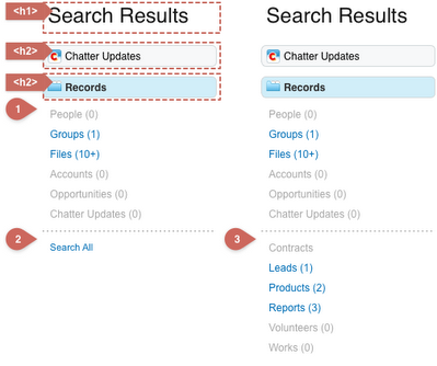 Sometimes a major section may still need a semantic heading, with the visual appearance of the heading moved off the screen. Below, Search Results is first level heading or <h1>, Chatter Updates and Records are both <h2>.