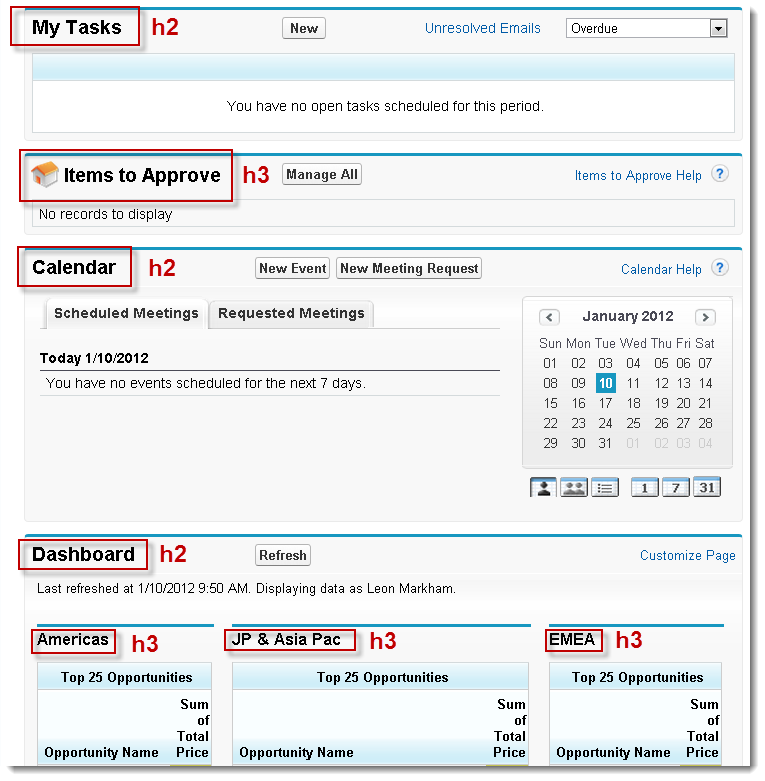 The example below shows a salesforce.com Home tab. Let's assume the page template contains an <h1>, so we will start with <h2>. My Tasks is a second level heading. Items to Approve, being one of my tasks yet still a major section of its own is given an <h3>. Calendar and Dashboard are on the same level of importance as My Tasks, so they are also <h2>. Since Americas, JP & Asia Pac, and EMEA are part of my dashboard, they are lower in the hierarchy than Dashboard and are labeled as <h3>.