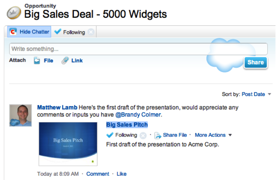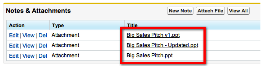 Anyone who is following the file will receive a notification in their Chatter feed when new versions are posted. This completely eliminates the guesswork of which version of a particular file is the most recent, and makes sure everyone is always using the most up-to-date information. It also helps keep your Notes & Attachments lists much cleaner, since each file, no matter how many versions have been uploaded, shows up only once.