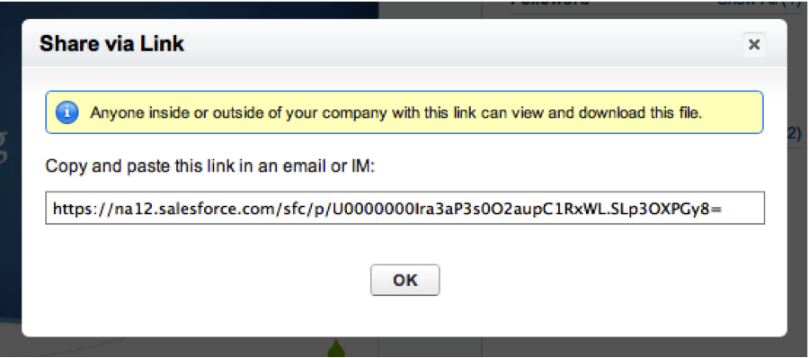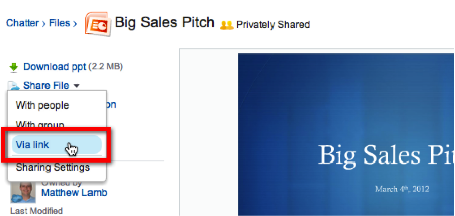 With Chatter Files, you’re able to share a link to the file with anyone inside or even outside your Salesforce organization. Simply open the File record you want to share, click “Share File” on the left side of the screen, then select “Via link.”
