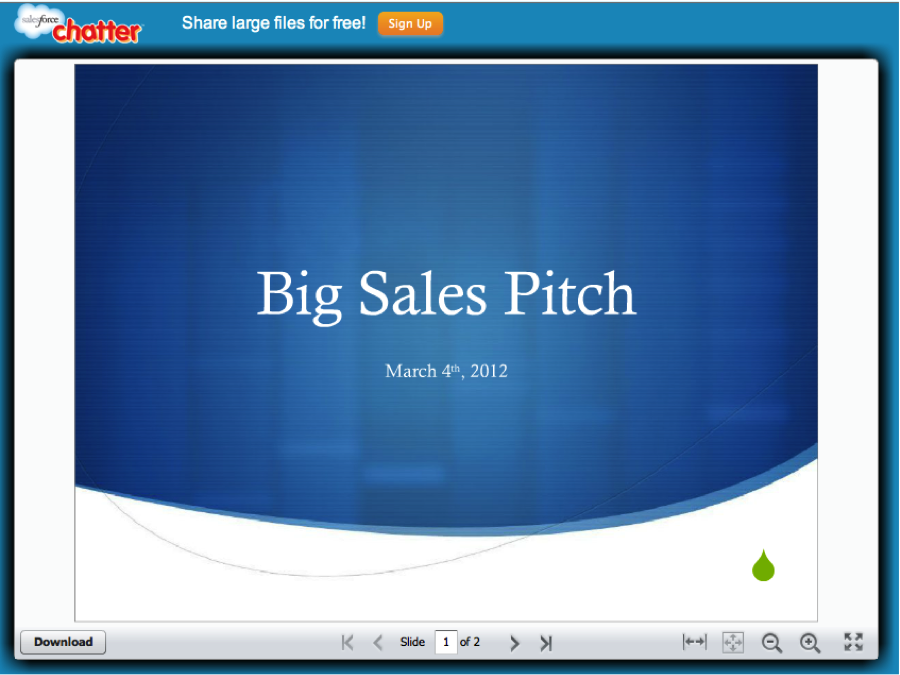 If you want to take a look at a file stored in the Notes & Attachments list, your only option is to download that file to your machine and then open it locally. With Chatter Files, many common file formats are supported for preview directly from your browser or mobile device, saving you the step of downloading one or more copies of the file.