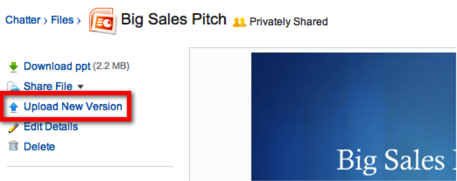 When you’re ready to upload a new version, simply open the file record, either from the Chatter post or from the Notes & Attachments list, and select Upload New Version from the left side of the screen: