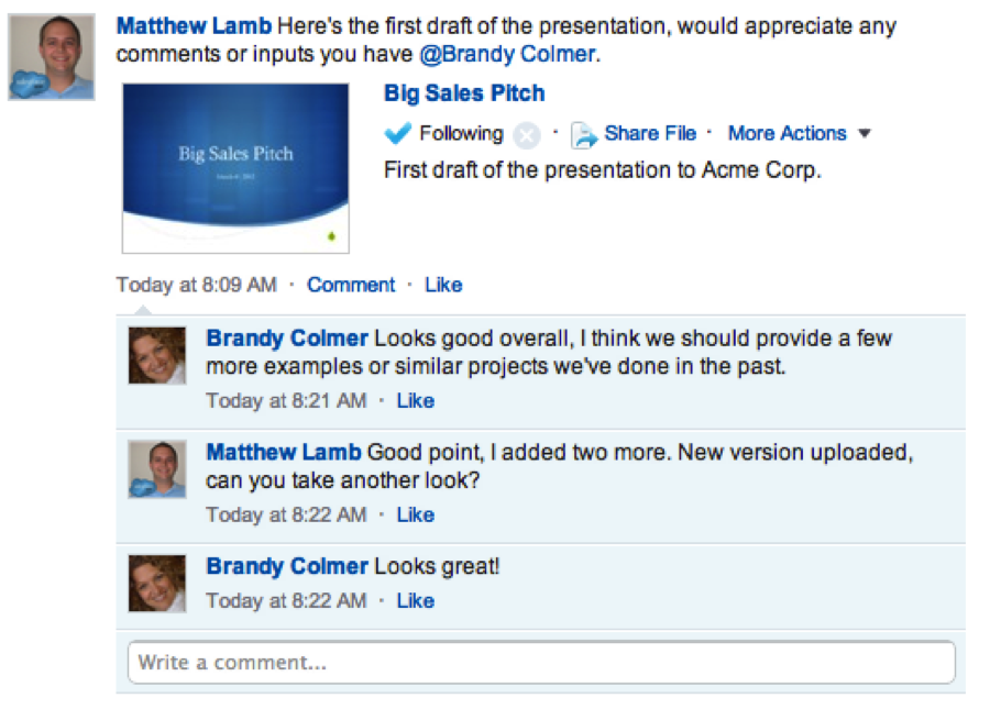 Not a problem for Chatter Files! After you upload the first version of the file to Chatter, you’ll see that file show up directly in your feed: