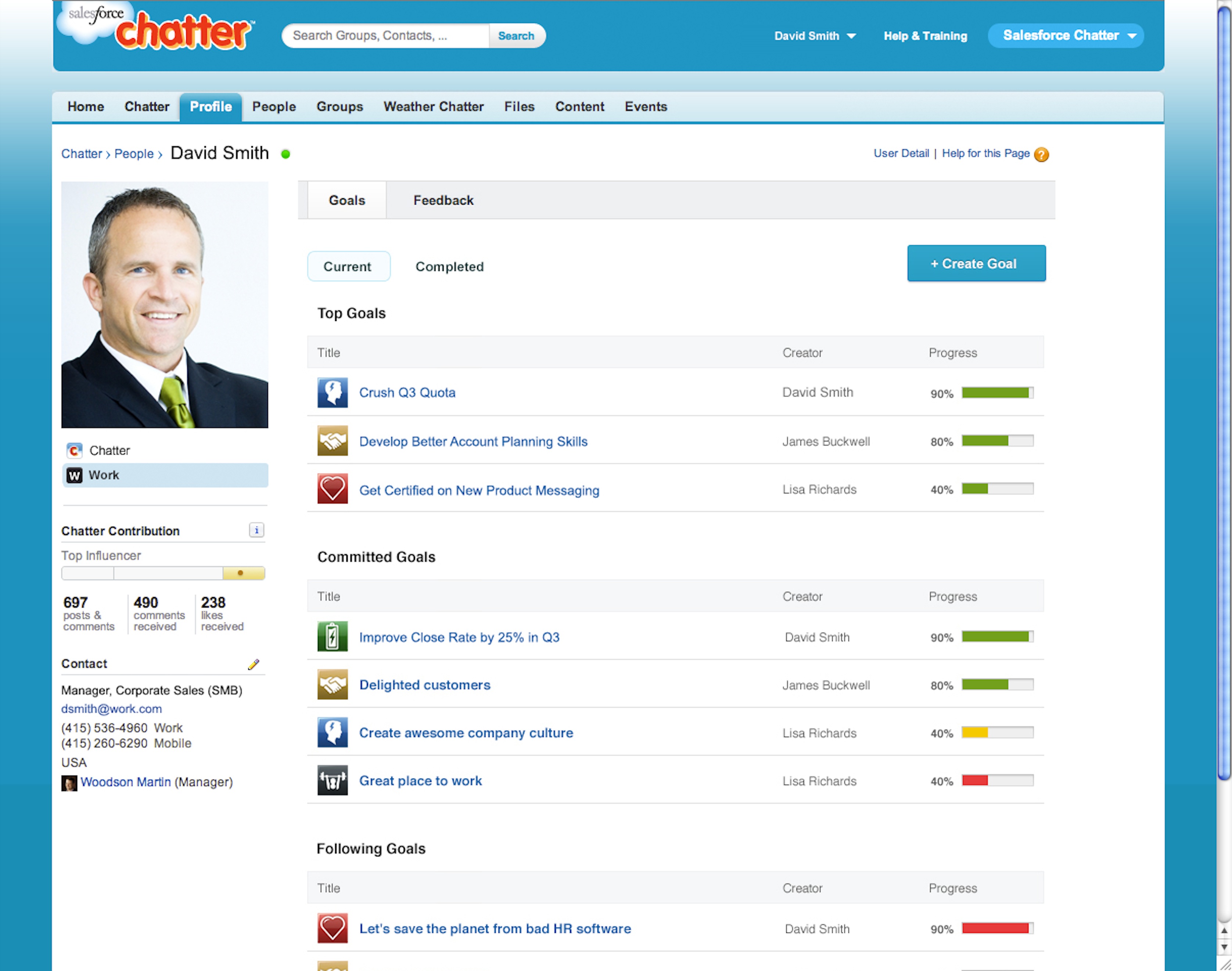 Work.com employee social profiles reflect their expertise, goals and performance right inside Chatter, helping them build their reputation.