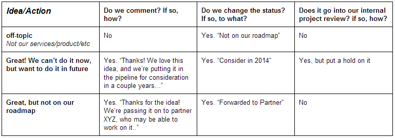 - Whatever you decide, make sure your response plan is clear to customers, both in the welcome email (if you send one), and also in a readily available “About” or FAQ on the Ideas site.