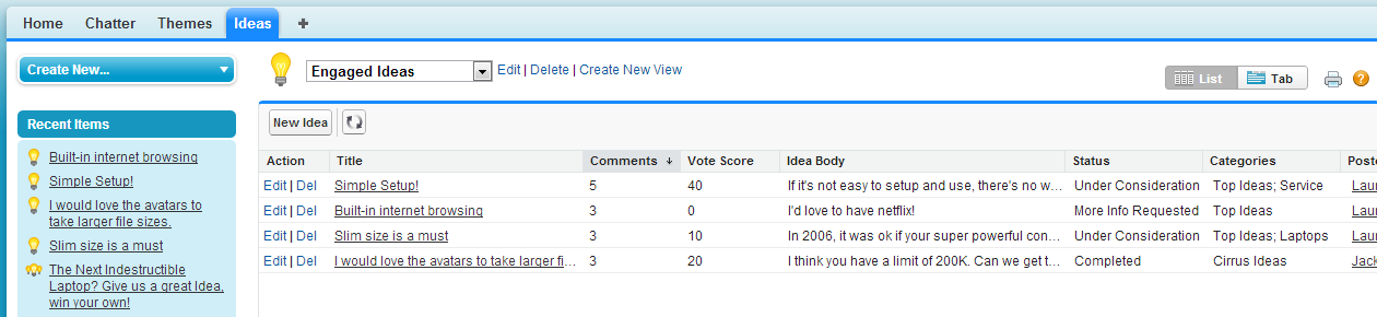 - You can engage with your community by commenting on the idea, changing its status, using Chatter, or even by emailing the ideator directly. Of course, the most important engagement is doing the idea, and telling your community (and the world) about it.