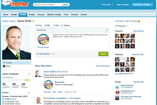 Sales teams will be able to see one another’s goals inside Salesforce Chatter or recognize great work right from within a Sales Cloud opportunity record. Work.com employee social profiles will reflect a rep’s expertise, goals, and performance right inside Chatter, helping her build her reputation.