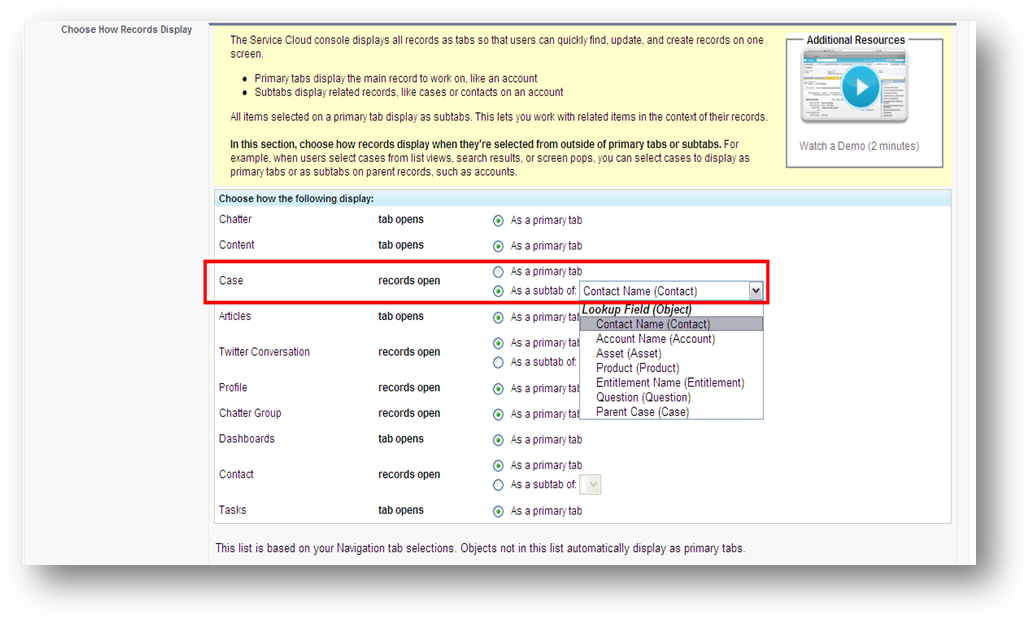 • Under the “Choose How Records Display” section, set case records to open as a subtab of the parent contact.