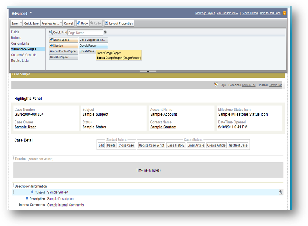 I named the Visualforce page above “GooglePopper”. In the image below, I add it to the case page layout using the “Visualforce Pages” section of the Page Layout Editor. You can drop the page anywhere on the case detail.