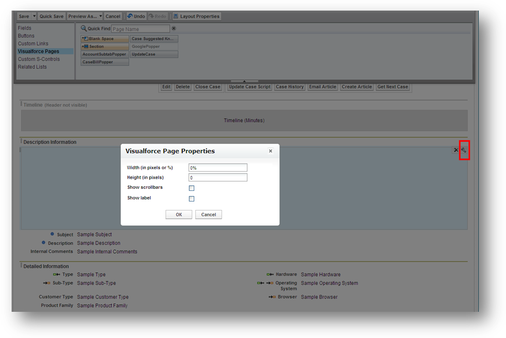 Once you have added the Visualforce page to your layout, be sure to alter its size so that it is not visible on the case detail page. You can do this by clicking on the little wrench icon on your newly added page (outlined in red in the following image) and bringing up the properties dialogue box. Set the height and width to 0.
