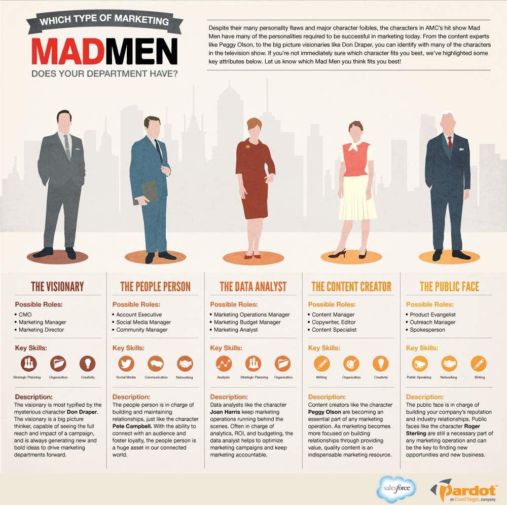 From the content creators like Peggy Olson to the the public faces like Roger Sterling, you probably work with more than a few people that fit one Mad Men personality or another. We’ve highlighted some of the most notable Mad Men personalities and how they would fit into today’s marketing departments in the fun infographic below. Take a look and don’t forget to let us know which Mad Men you’re most like!