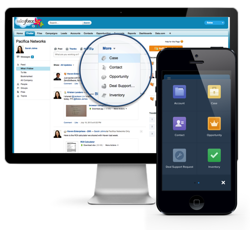 With custom actions in Chatter users can create a record faster than ever before. This is ideal for mobile salespeople, service reps, or even delivery people who need to take advantage of every moment, including creating everything from new contacts or sales tasks to custom actions such as on-site product verifications or new orders. Publisher actions can also make users more efficient and improve adoption by providing contextual, concise forms, right in the Chatter feed.