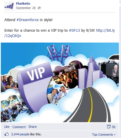 You can use a variety of visual tactics on Facebook to promote registration and create engagement opportunities during your event. Before every event, create a graphic that you will use on your social networks. Your graphic should not only be eye catching, but it should also include relevant information about the event like name, time, date, hashtag, and a registration link. Take a look below at our Facebook post for an upcoming Dreamforce 2013 promotion we are doing. Notice we have the event name and hashtag, a compelling statement and call-to-action, a link to register and a fun visual.