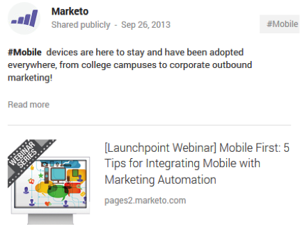 The Google+ Events feature allows Google+ users to send out customized invitations to anyone regardless of whether they are Google+ users. It syncs beautifully with Google Calendar and shows up automatically when a user confirms for an event. In addition to sending out invites to webinars, tradeshows, work functions, parties, etc., Google Events can also send out invites for Google+ Hangouts. Invite tradeshow attendees to a Google+ Hangout to get influencers, customers, and prospects in the same place discussing highlights of the event. Schedule individual times for discussion or have your Hangout open the entire day. Make sure you are posting event highlights and photos throughout the day as well. Here is an example of a typical event post we add to Google+ to drive registration: