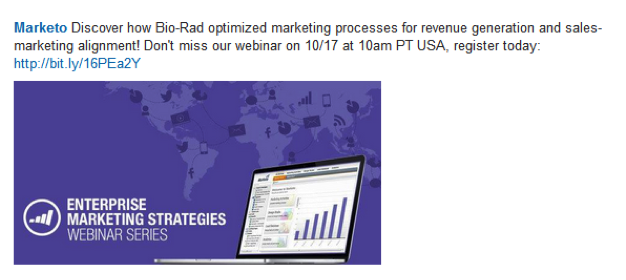 At Marketo, we make a graphic for every webinar and event that we promote. We find that it increases our post engagement and captures the attention of our fans on social networks. We have seen an uptick in registration by using this tactic, particularly in a promoted post.