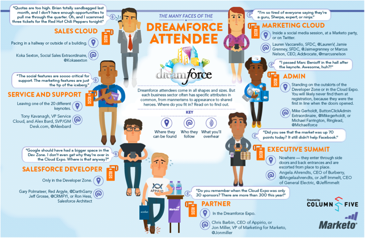 Creating an infographic about your event or series of events is a fantastic way to get someone excited about attending. Not only is it a fun and unique visual take on events, but it also provides your audience with important logistical information in a way that is easy to understand. Infographics work best if you are sponsoring a large event or hosting your own event. You can even create one infographic depicting all of the events you will participate in during a given year. And because infographics are super shareable, they will give you a social lift. Check out an infographic we used to promote last year’s Dreamforce event: