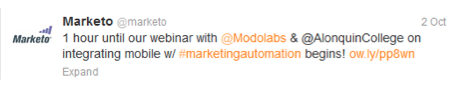 Also, encourage your partner and influencer network to promote your event. You can build Twitter lists to include speakers, sponsors, and people who are already talking about your event. At Marketo, we also set up promoted tweets and bid on our company name and event hashtag.