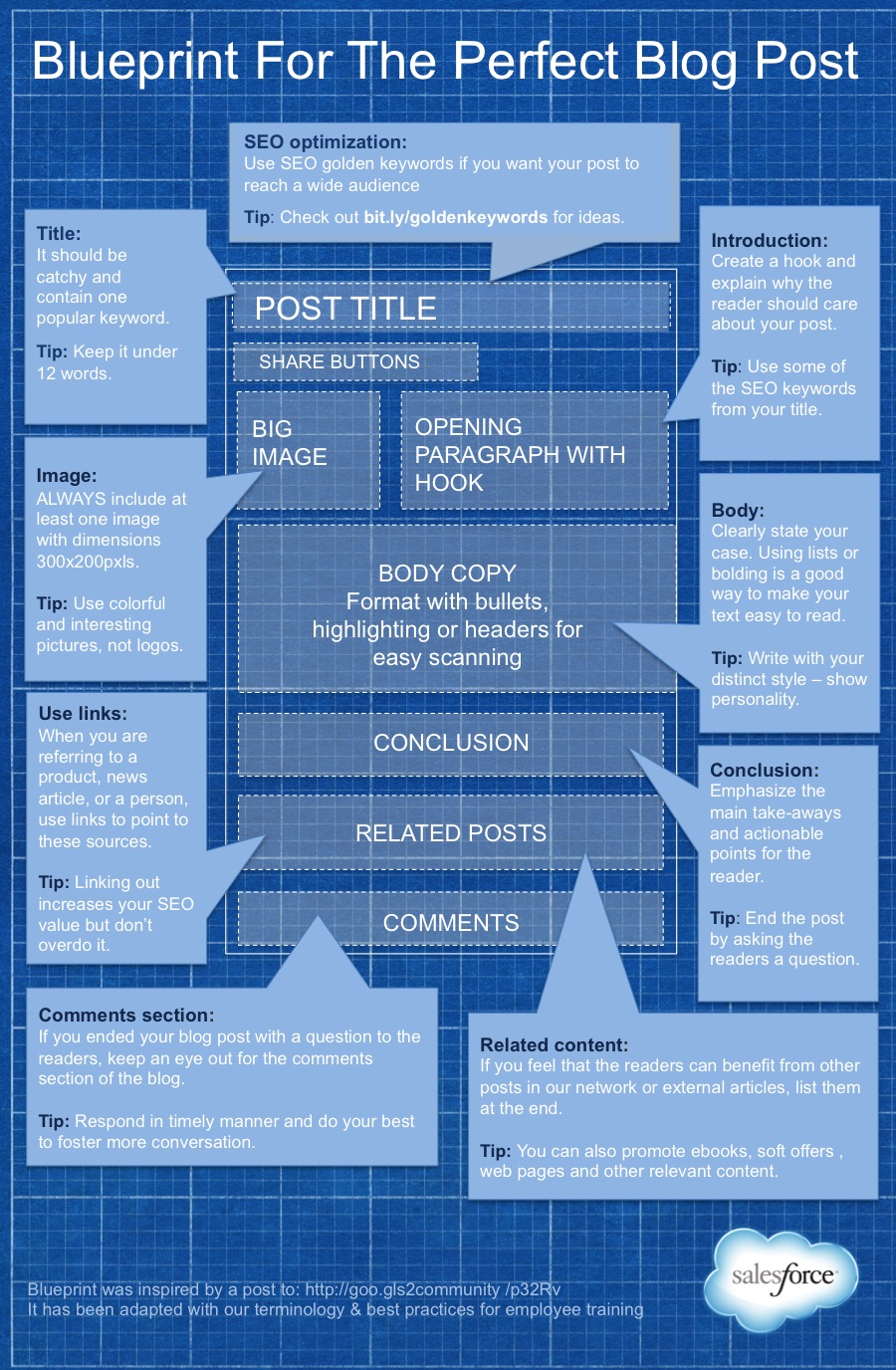To create the best possible blog post every time, follow the tips in the blueprint below. Doing so can boost shares, views and comments-- just what every blogger wants.