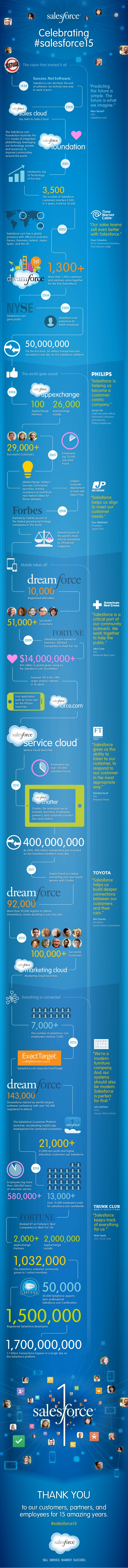 Join the celebration by sharing your own salesforce.com story, memory, or moment with the hashtag #salesforce15 and visit www.salesforce.com/15. The past 15 years have been truly amazing and we look forward to the future as we shape it together!