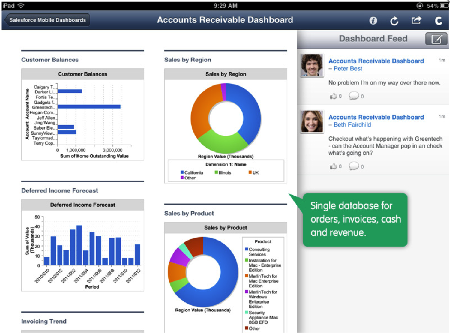 Gone are the days of siloed information, where service has one slice of customer data, finance has another, and sales has yet another. Now accounting apps like FinancialForce Accounting live on the same cloud as Salesforce CRM, so everyone in your company shares the same real-time financial data, which means your customer always gets the same information, no matter which department she talks to. She’s happy and no one internally becomes the bad guy.