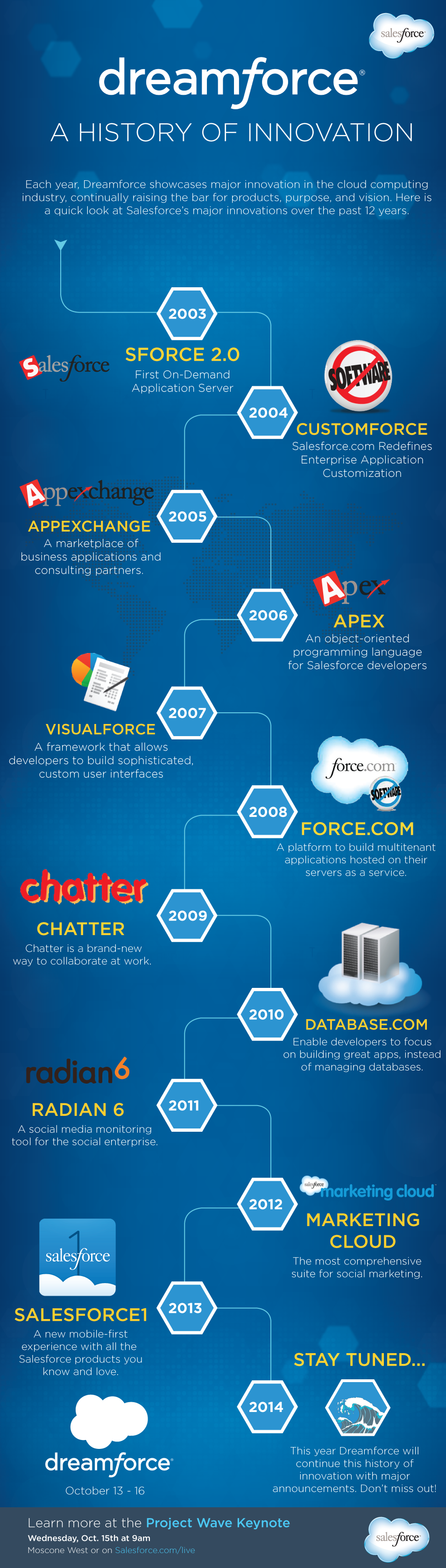 We've created the infographic below to highlight some of Dreamforce's biggest moments and to set the stage for this year's big announcement! And if you are coming to the show, we can’t wait to share with you Project Wave — one of our biggest innovations to date, and an initiative we have been working on for two years.