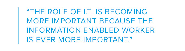 The role of IT is becoming more important because the information enabled worker is ever more important. It’s a challenge for IT in the following sense; what IT did before and what it needs to do now are two very different things. It used to take very conventional processes and help automate them. And it provided routine services such as laptops, cell phones, and a little bit of software to executives and employees. What’s happening now is that software capabilities are enabling people further down in the organization to have better productivity tools. So everybody will have the equivalent of an assistant. And IT is a big part of making this happen.