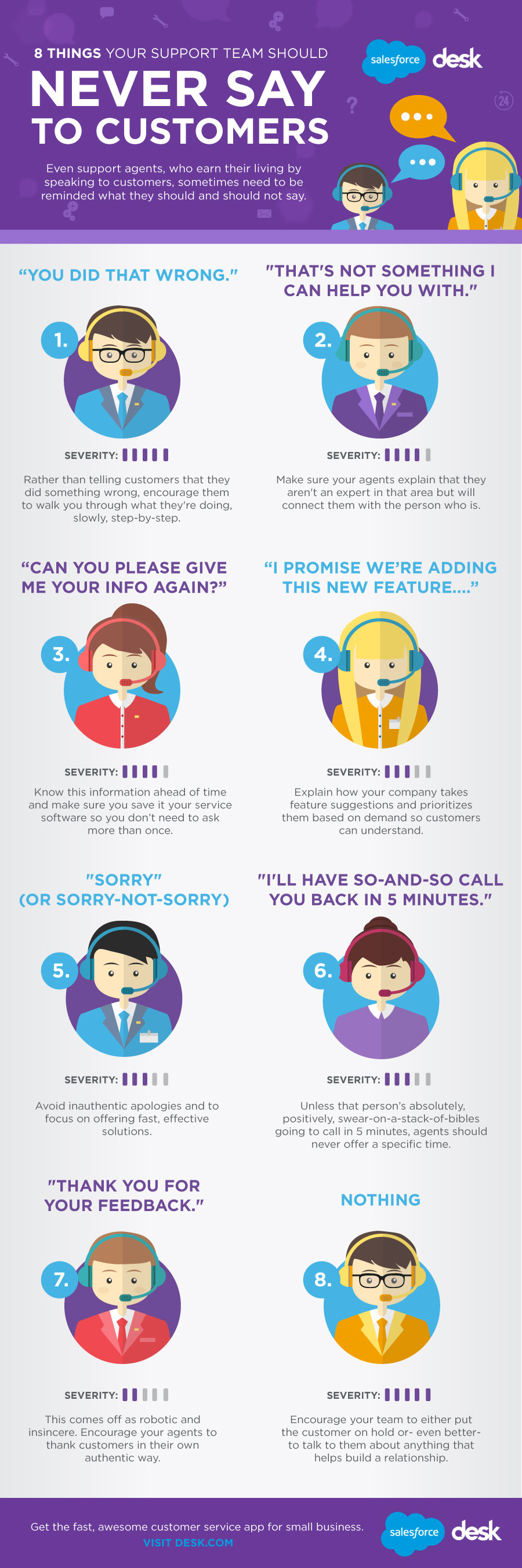 Even support agents, who earn their living by speaking to customers, sometimes, need to be reminded what they should and should not say. At Desk.com we talk to a lot of customer service professionals. Ranging from merely cringe-worthy to enraging, here are eight things they recommend your team should never say to customers so that you can deliver the best possible service: