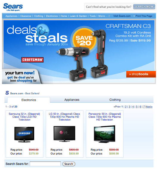 This is not the first time that this functionality has appeared in an email. In early 2010, Gmail did beta tests on a feature called “Enhanced Email” that used JavaScript to enable tabbed boxes within emails. For instance, this January 2010 Sears email below included a module with three tabs, each of which contained multiple “pages” of products that subscribers could flip through without leaving the inbox.