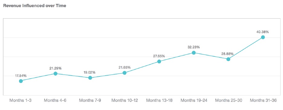 Predictive intelligence's strengths are most pronounced when looking at long-term lift, as shown in this chart, which depicts the influence of predictive intelligence on revenue over 36 months. Revenue increased more than 40 percent after 36 months of using predictive intelligence.