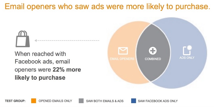 For example, in a case study of one major online retailer, Facebook ads were matched with a group of email subscribers to create a Facebook Custom Audience. This audience was then targeted with both email and Facebook ads for two weeks, finding that when first reached with Facebook ads, email openers were 22 percent more likely to purchase. Social audiences become more likely to purchase when they receive emails, and email subscribers become more frequent openers when they see Facebook ads. It’s a win for both channels.