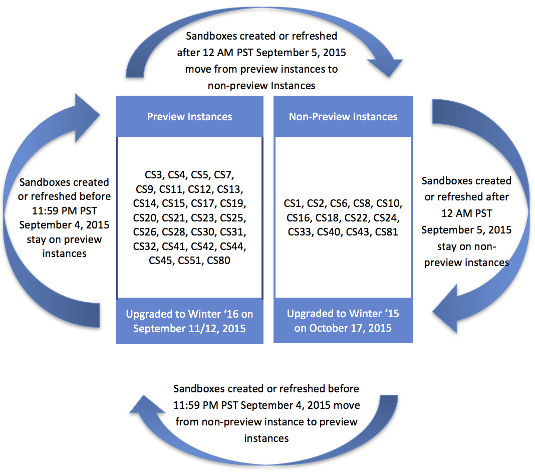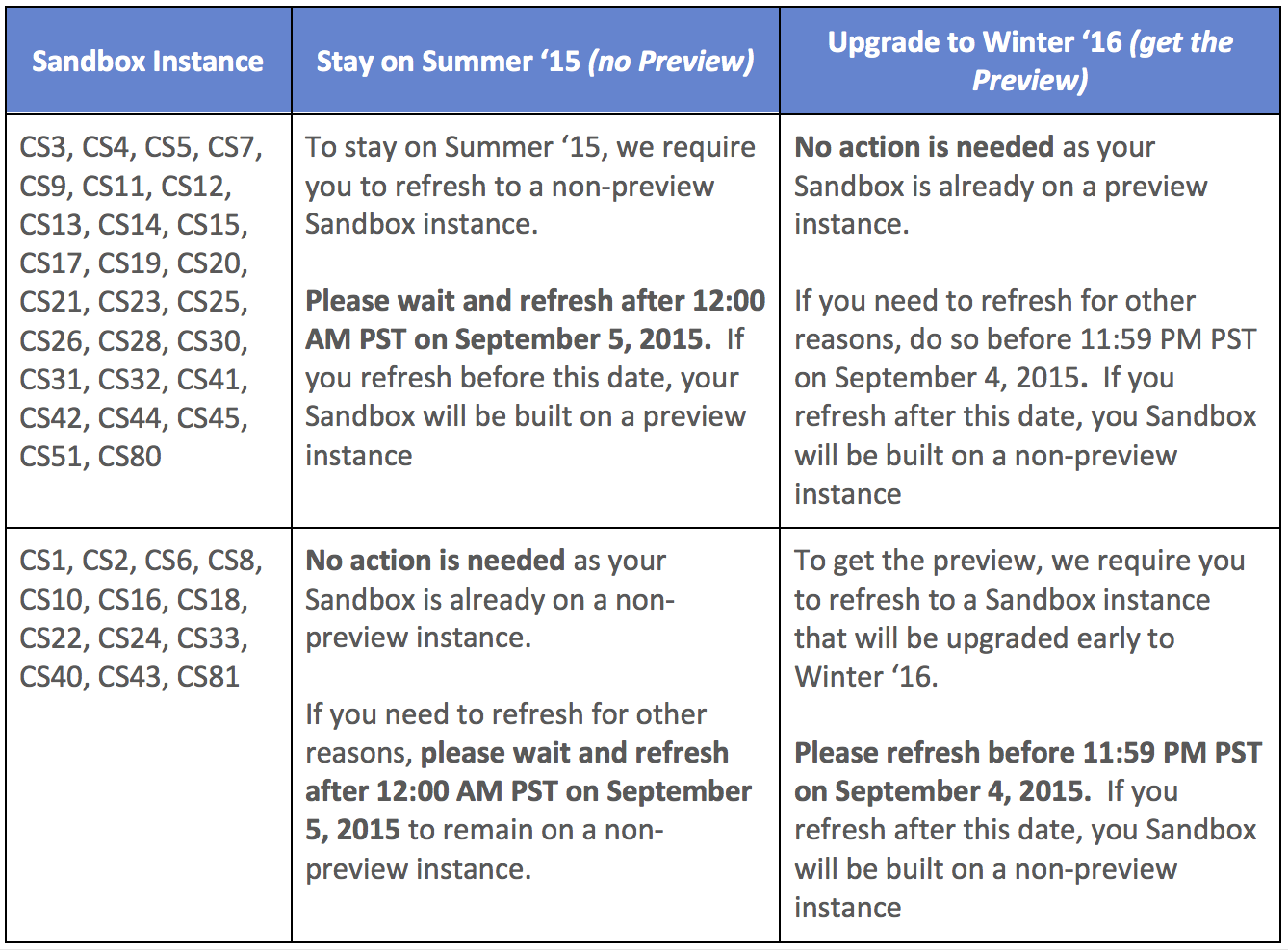Starting September 5, 2015, all creation and refresh requests will be routed to non-preview instances until your production instance is upgraded to Winter ‘16.