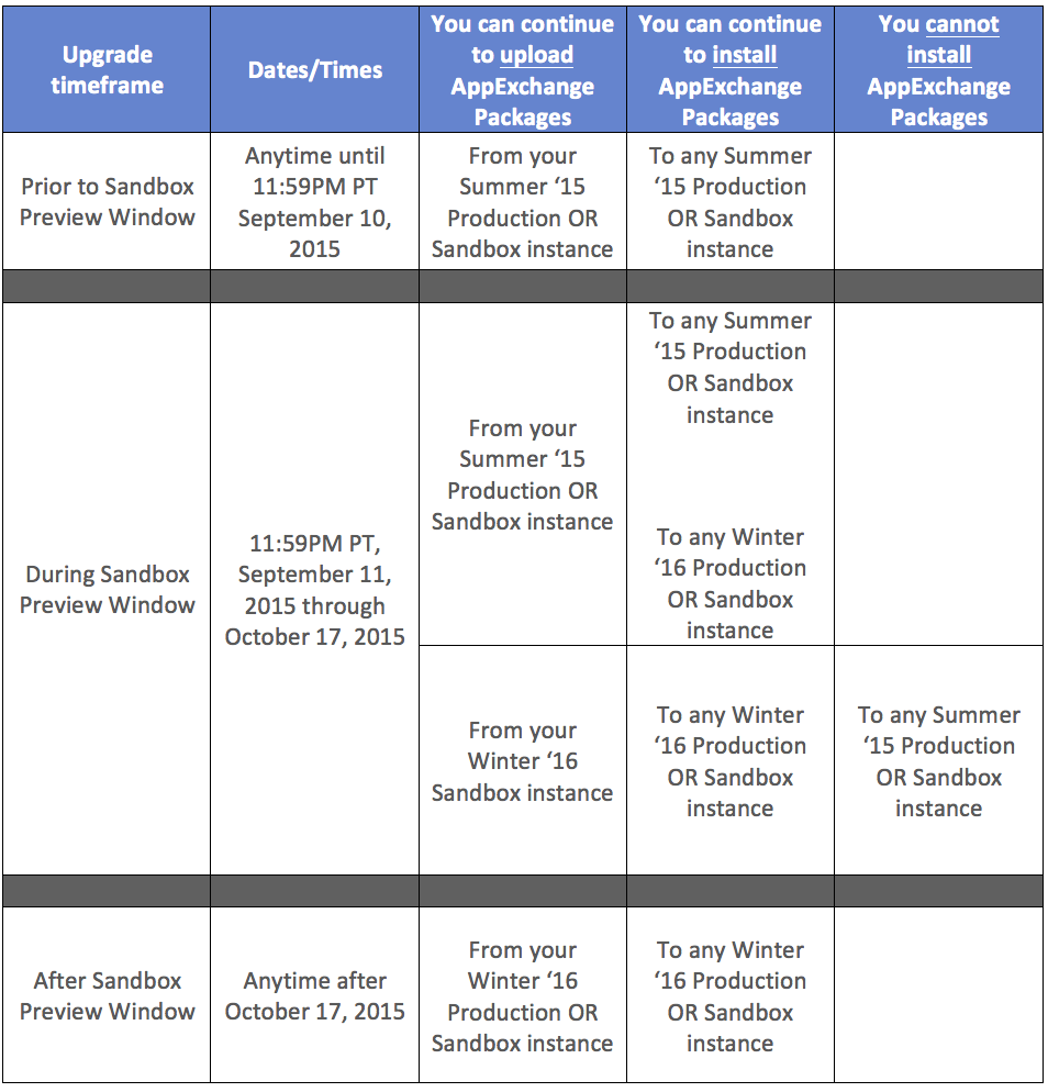 If you plan to upload and/or install one or more AppExchange packages using your Sandboxes during the Sandbox Preview Window, you should use the chart below to determine your course of action.