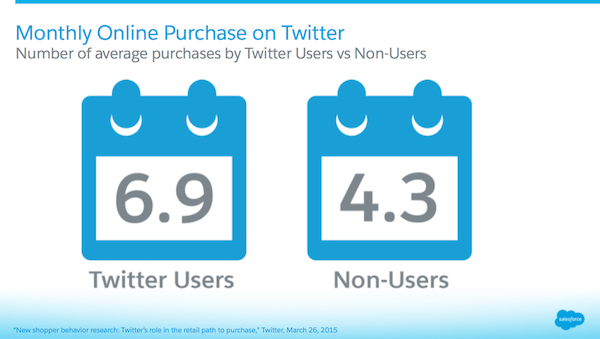 Retail ad spend will reach $13B in 2015 and $20B by 2019, a CAGR of over 12% (2014 to 2019). Retail is responsible for over one fifth of all digital ad spend and will be through 2019. Where will the majority of retail spend be directed? Mobile ad spend will reach over 51% of total retail ad spend in 2015 at $75B and estimated to grow to $150B by 2019. 82% of Smartphone users will shop on their mobile device this year, and 81% research on their phones before a purchase decision. Retail advertisers this year will ramp up spend on video at $1.6B on digital, equating 20% of total retail ad spend. Twitter has long been an online shopper’s go-to for insight, assistance, and inspiration during the purchase cycle. Given the platform’s mobile-first nature, it’s no surprise to find that Twitter users were likely to spend 22% more online shopping than non-users from March to September this year. On average, users made online purchases 6.9 times/month, as opposed to 4.3 like non-users.