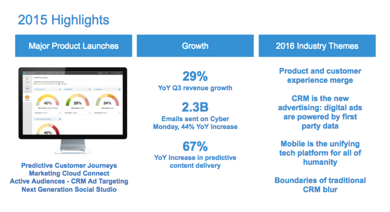 Our powerful new Predictive Journeys help marketers harness the power of data science to analyze customer engagement and predict the optimal next step in every journey. We continued to innovate in social marketing with the next generation of Social Studio. And we stayed true to our core -- digital marketers rated Marketing Cloud #1 in email marketing. It was a great 2015. Thank you!