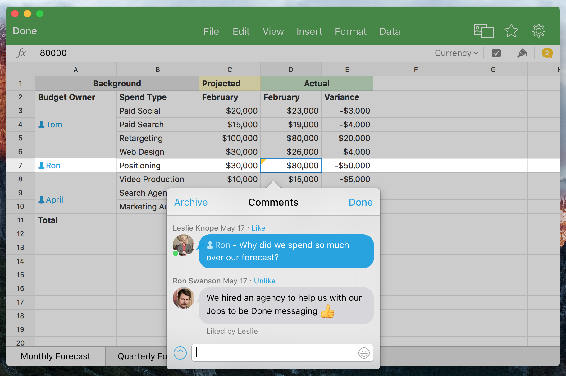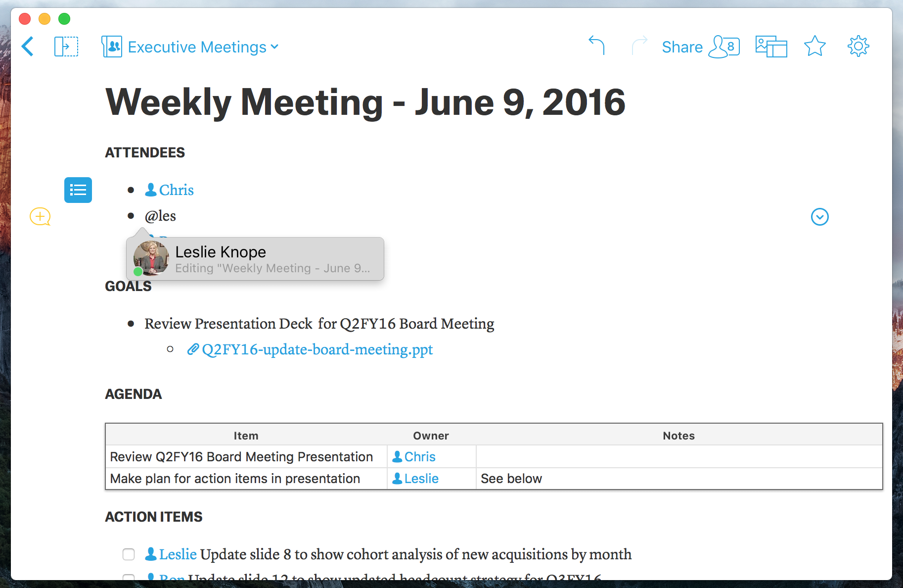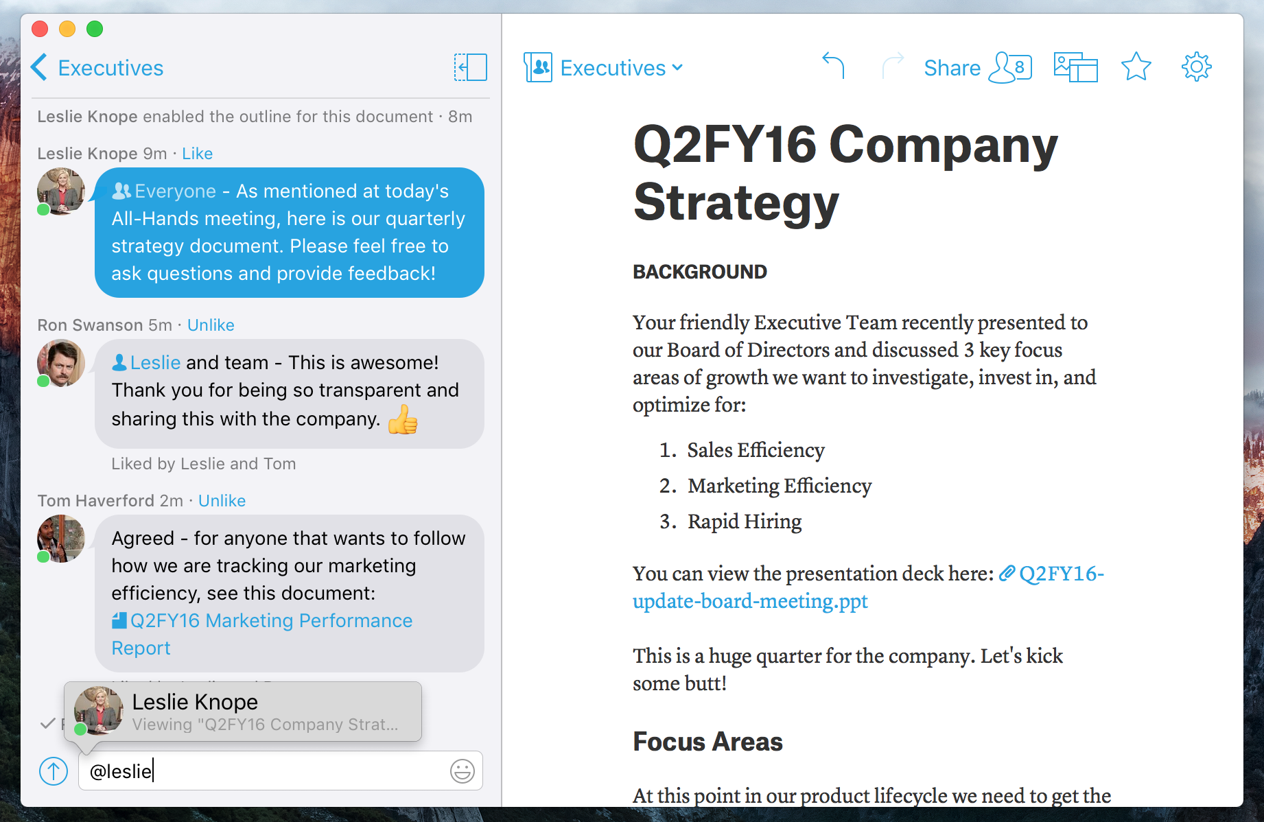 In order to work faster and make better decisions, context is everything. When you have to jump between an email and a file it slows you down. In Quip, you can give targeted feedback and ask questions about specific words and cells in your work. @mentions are an effective way to bring your teammates into conversations where there's context so it's easy to jump in and contribute.