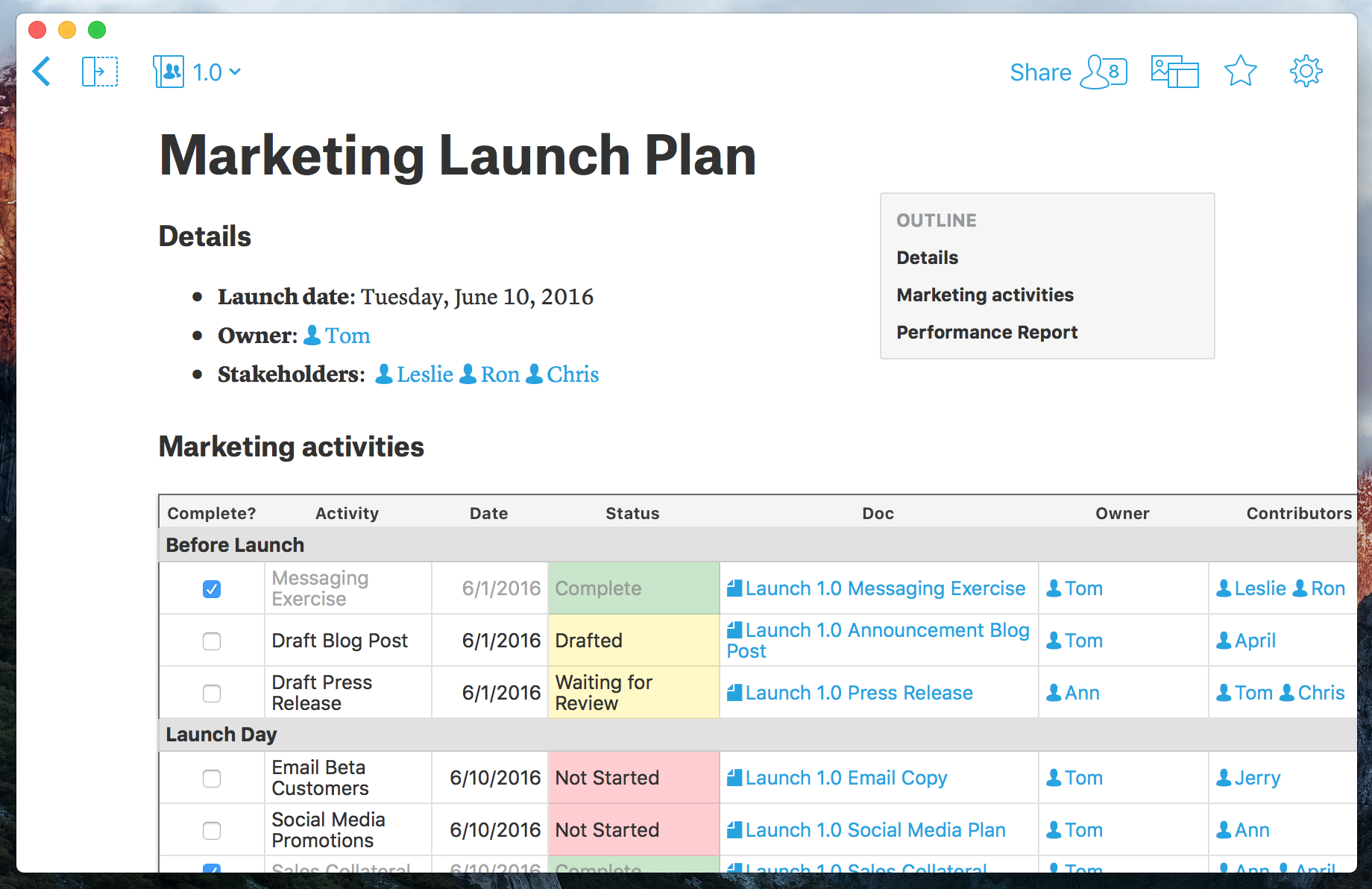 Quip's documents and spreadsheets are perfect for building and sharing project plans. Everyone on your team has visibility, access, and the tools they need, like @mentions and tasks, to stay aligned on your project.