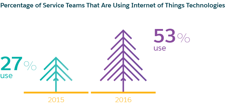 In a new study, “Second Annual State of Service,” Salesforce Research found that service teams using IoT doubled from 2015 to 2016, from 27% to 53%. The IoT creates a whole new arena for how service agents are connecting with customers. The proliferation of connected-devices, the volume of data they produce, and the unique value of that data make the IoT a special area of interest for service leaders.