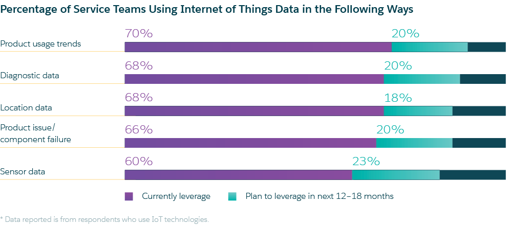 For service teams today, the most popular data types they’re using (or planning to use) for IoT purposes include product usage trends, diagnostic data, and location data.
