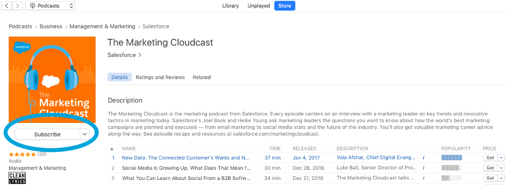 New to podcast subscriptions in iTunes? Search for “Marketing Cloudcast” in the iTunes Store and click Subscribe, as shown below.