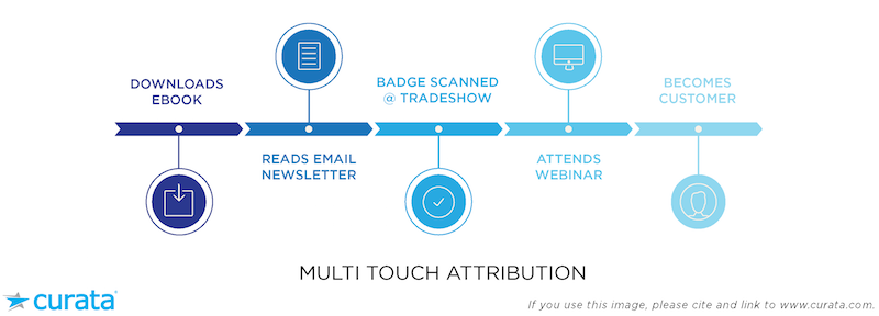 Multi-touch attribution gives credit to all interactions and touchpoints of a buyer throughout the sales cycle. In this example, an eBook, newsletter, badge scan at the tradeshow, and a webinar all receive equal credit for the sale.