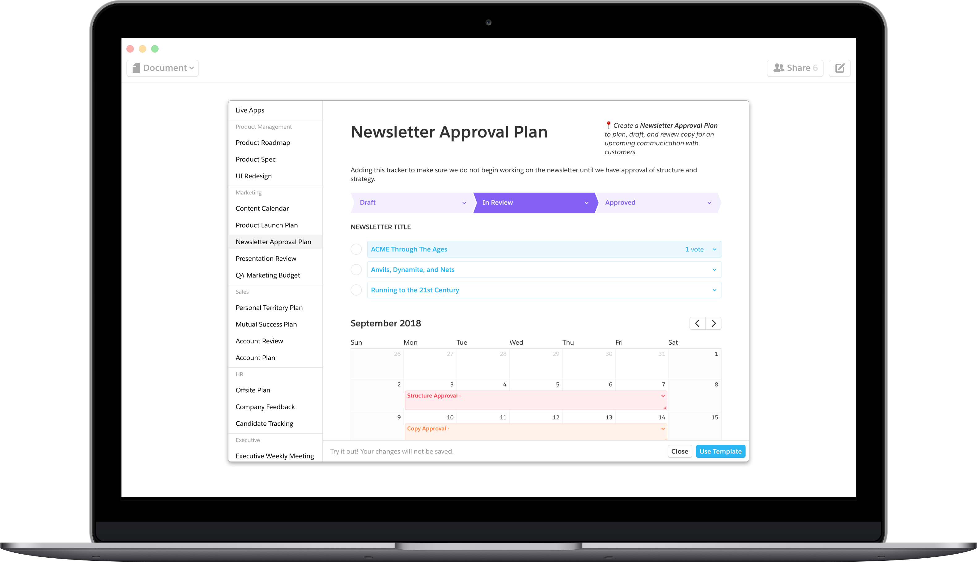 To show how Live Apps truly bring superpowers to your team's documents, we pre-built a handful of templates for you. Each of these Quip documents has a custom recipe of Live Apps based on specific team functions — like territory plans for sales teams, and roadmaps for product teams. Templates are ready for your team to start using right away: Find them in your Quip sidebar and at the bottom of every new Quip document. Edit them to create the perfect custom workflow for your team!