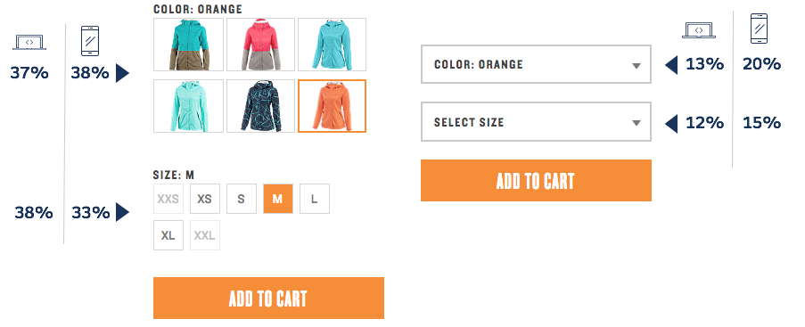 On the desktop, color and size attributes average a 38% click rate when they are displayed as swatches, and only 12% when drop-downs. For mobile, drop-downs performed slightly better at 17%, and swatches maintained at about 36% click rate. When we dug a little deeper into our data we saw an 11% average add-to-cart rate for swatches compared to just 5% for drop-downs. However, this is not to say drop-downs should never be used as a UX element over swatches. The complexity of a product and the number of attributes may lend itself to one over another.
