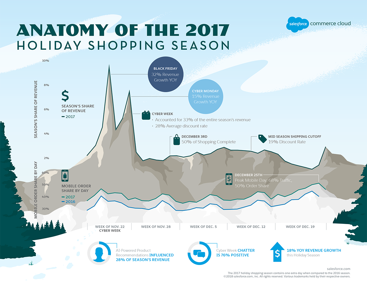 Shoppers pulled their purchases earlier than ever in 2017, with Thanksgiving Day emerging as a top digital shopping day. Thanksgiving Day revenue was up 31% over 2016, a 74% increase over 2016’s growth. In fact, 32% of the entire season’s revenue was made Thanksgiving Day through Cyber Monday, an increase of 9% from lasts year’s 29% revenue share over the same period. With shoppers deciding when (and how) they want to shop, retailers should be prepared to focus on meeting shoppers where they already are in the new year: mobile and social.