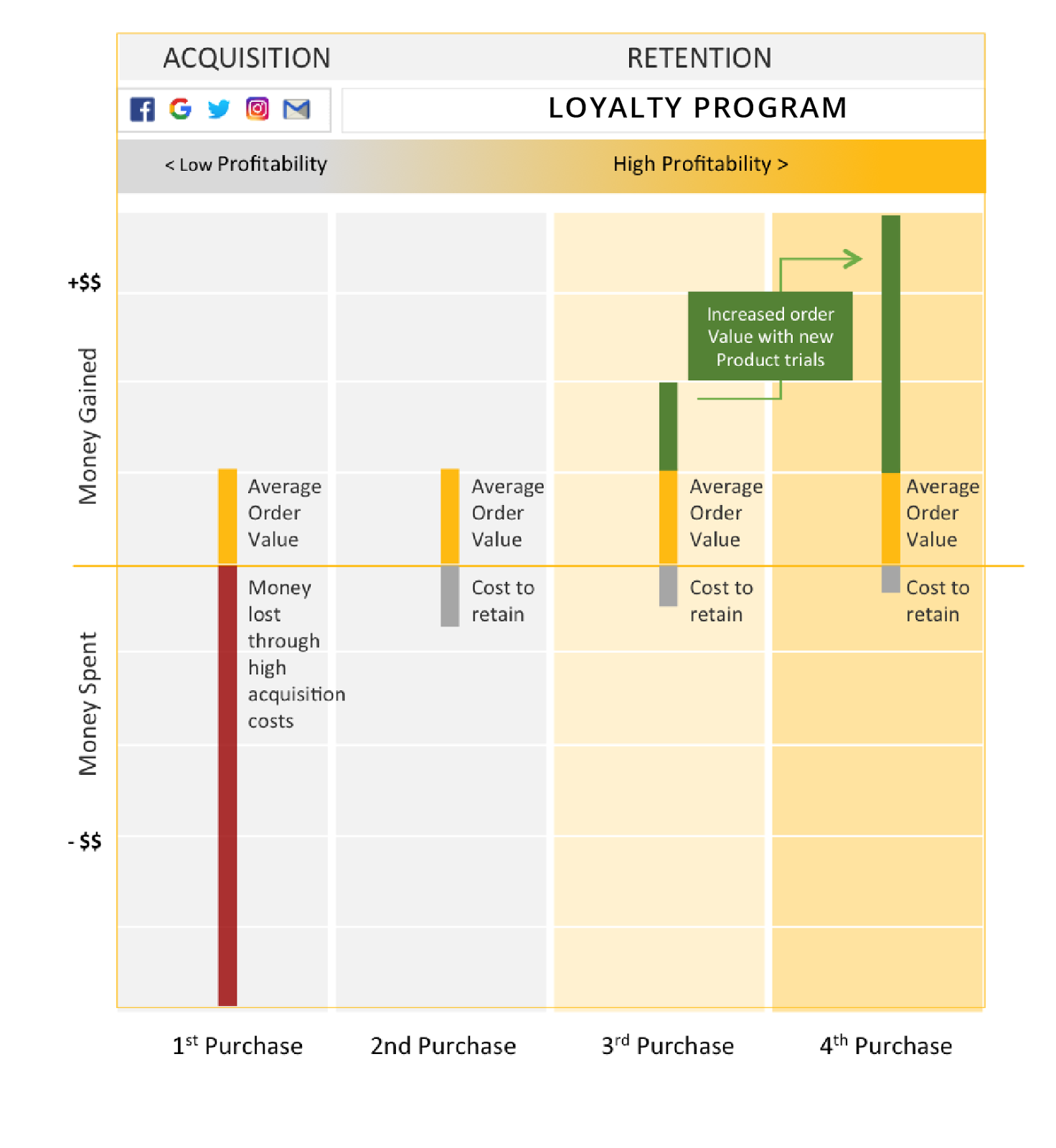 The chart below hows how profitability improves as customers engage and buy more often.