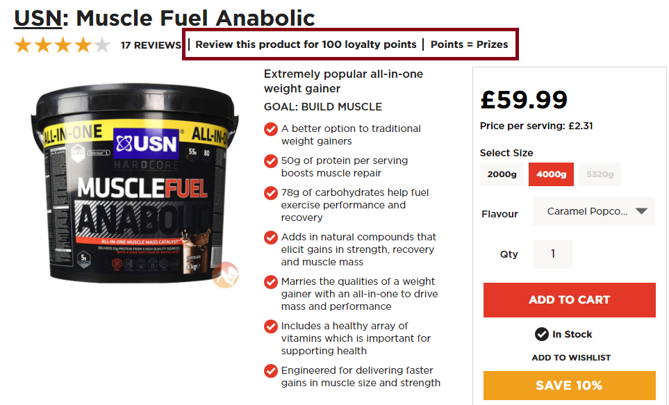 Shown below is an example of how Predator Nutrition awarded 100 points for every product review. Using this strategy, Predator Nutrition got three times more product reviews and a significant improvement in conversion rate.